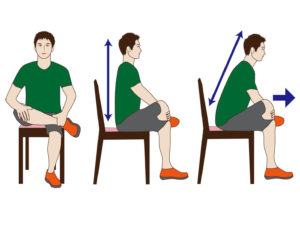 椅子に浅く腰かけ、片方の足首を反対の太ももに乗せます。